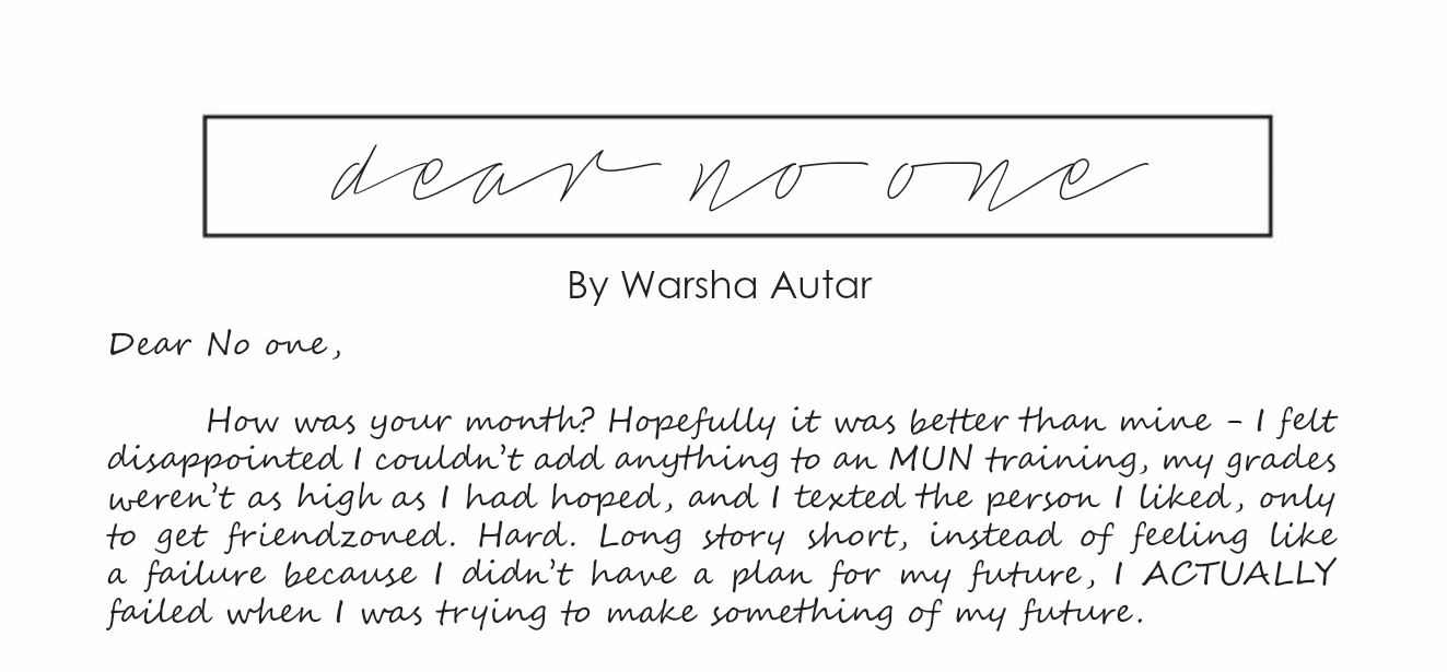 How was your month? Hopefully it was better than mine – I felt disappointed I couldn’t add anything to an MUN training, my grades weren’t as high as I had hoped, and I texted the person I liked, only to get friendzoned. Hard. Long story short, instead of feeling like a failure because I didn’t have a plan for my future, I ACTUALLY failed when I was trying to make something of my future.